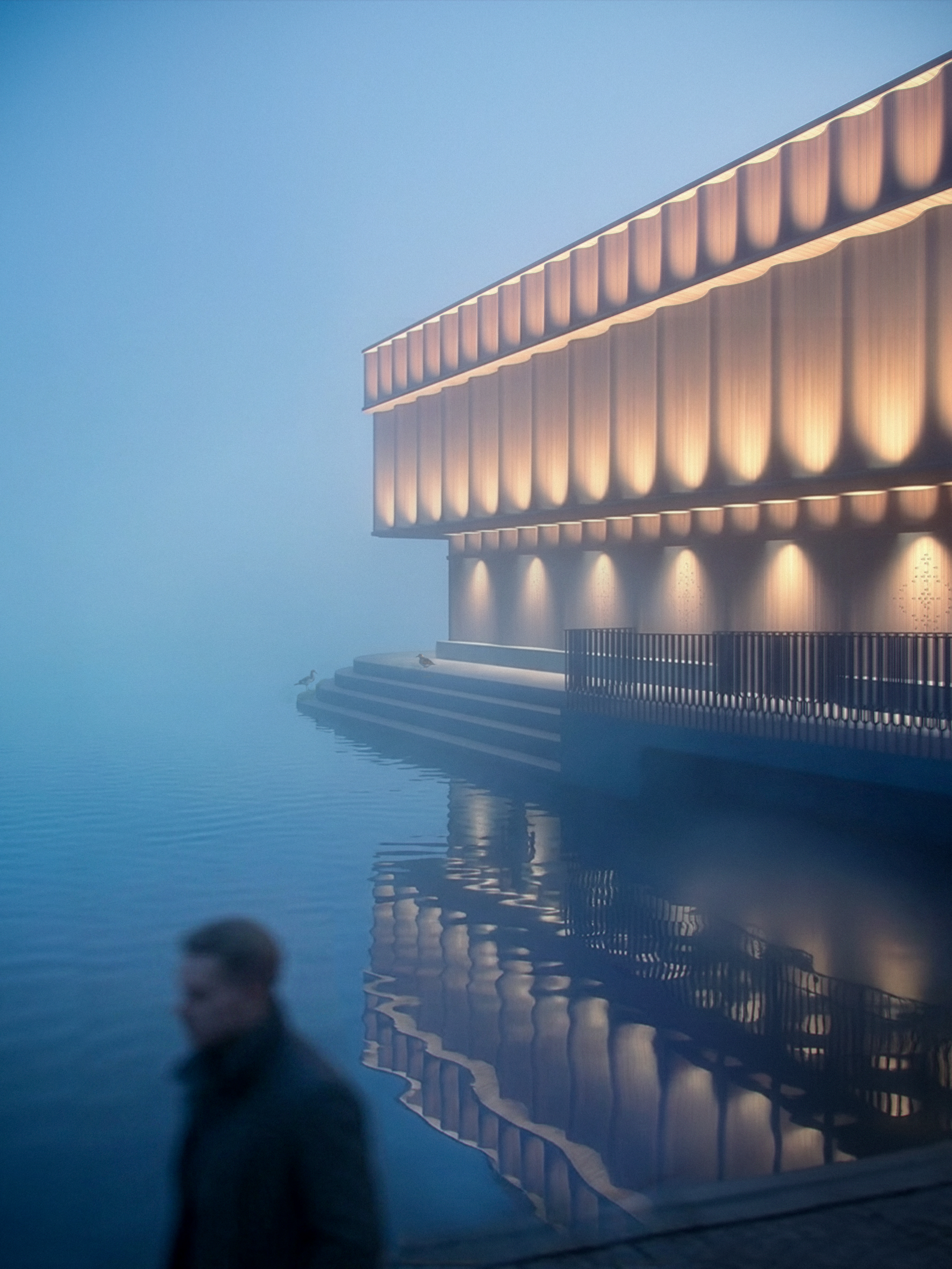 Belysningen är integrerad i fasadens struktur, där ljuset rör sig subtilt som ett musikaliskt pulsslag. På natten förvandlas byggnaden till en lysande fyrbåk – en symbol för musikens närvaro och stadens kulturella liv.