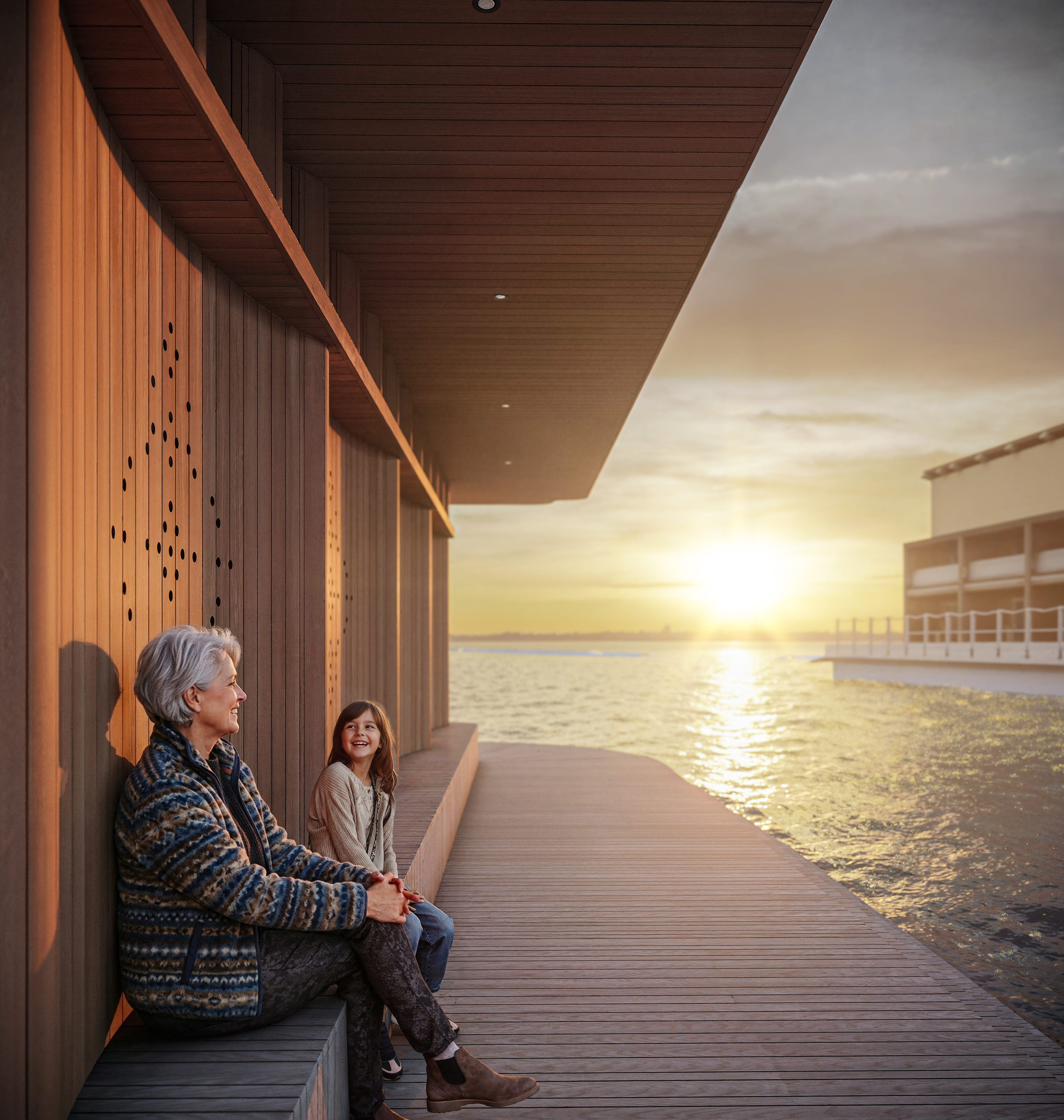 Det utkragande taket och den rytmiserande träytan skapar skyddade platser längs byggnadens sidor där människor kan sitta, vila och lyssna på musik som strömmar ut från högtalare som är omsorgsfullt integrerade i arkitekturen.